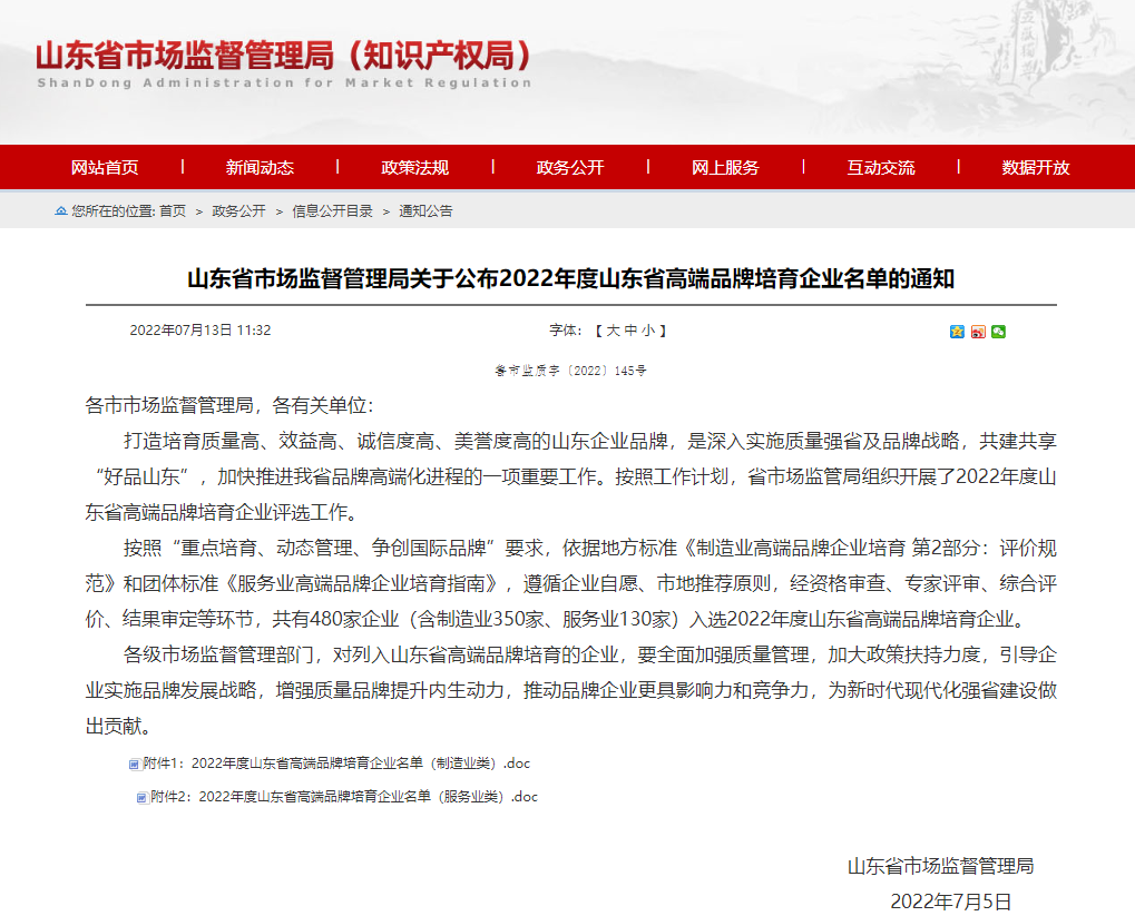 为打造培育质量高、效益高、诚信度高、美誉度高的山东企业品牌,加快推进我省品牌高端化进程。山东省市场监管局组织召开了2022年度山东省高端品牌培育企业评选工作。